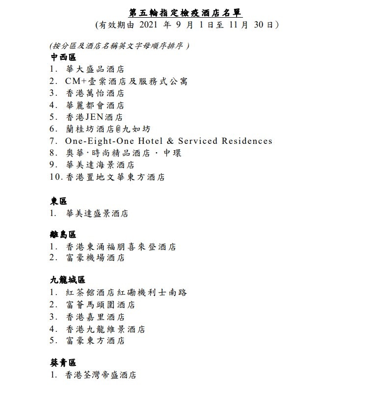 Cm+壹棠酒店及服務式公寓 地址:香港上環干諾道西 16 號 電話:3560 6738. 指定檢疫酒店名單 (有效期由 2021 年 2 月 20 日至 4 月 20 日) (按分區及酒店名稱英文字母順序排序 ) 中西區 1. 華大盛品酒店 地址:德輔道西 308 號 電話:3410 3333.